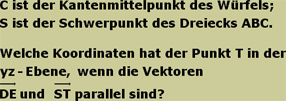 B(-2|5|-1) sowie der Diagonalenschnittpunkt E(-1|2|3) gegeben.